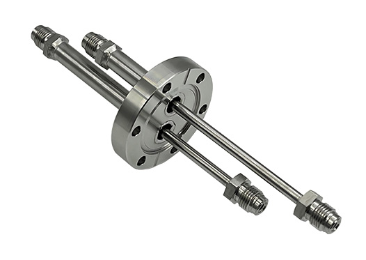采用VCR接頭的低溫流體饋通,可通過低溫氣體、液氮等低溫流體介質。常用管徑1/4",法蘭管道及VCR接頭材質均為316不銹鋼,溫度范圍-200~450℃,極限真空<1E-10mbar。不同的安裝法蘭和管道數量供選擇,可咨詢定制法蘭尺寸、管道直徑、管道長度等參數,也可選擇單管道的標準安裝基座饋通。可提供饋通真空端相關配件。